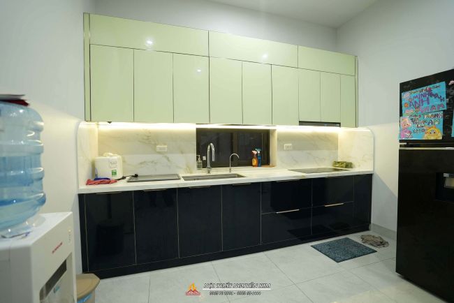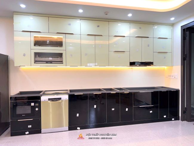Mẫu tủ bếp cánh kính trắng kết hợp đen nhà anh Mạnh, Thanh Oai