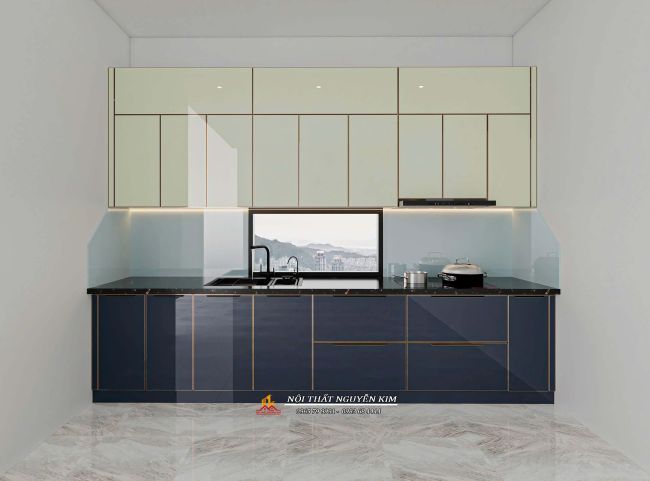 Sự phối màu be kết hợp xanh navy cho tủ bếp anh Quyền, Kim Thành, Hải Dương