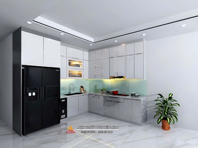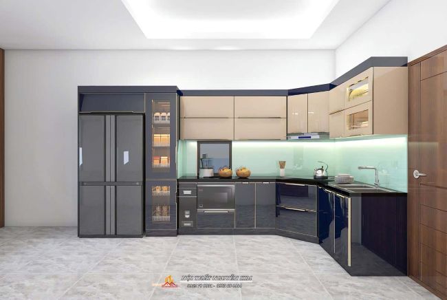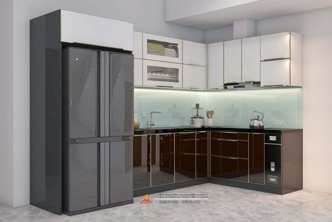 Tủ bếp chữ L inox cánh kính màu đen với điểm nhấn màu trắng cho hệ tủ bếp trên