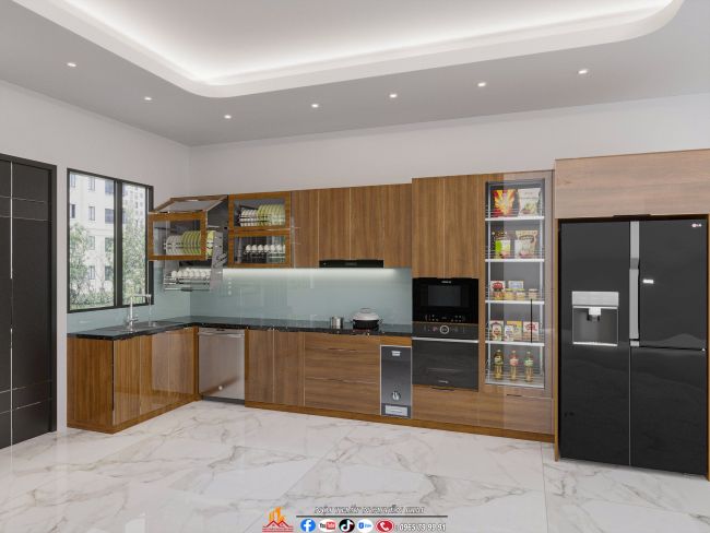 - Tủ bếp chữ L: tận dụng góc tường, mở rộng không gian cho nhà phố, nhà ống.
