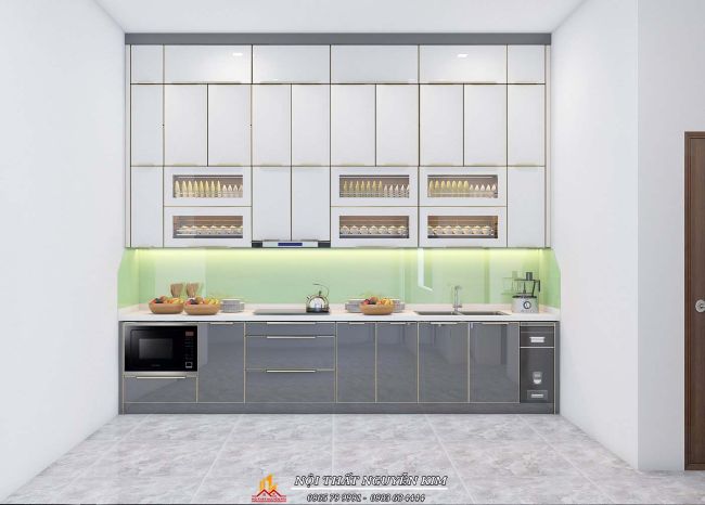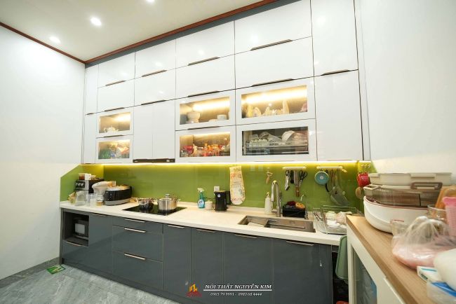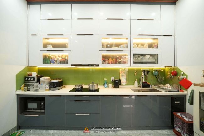 Tủ bếp dưới cánh kính màu ghi, tủ trên cánh kính màu trắng