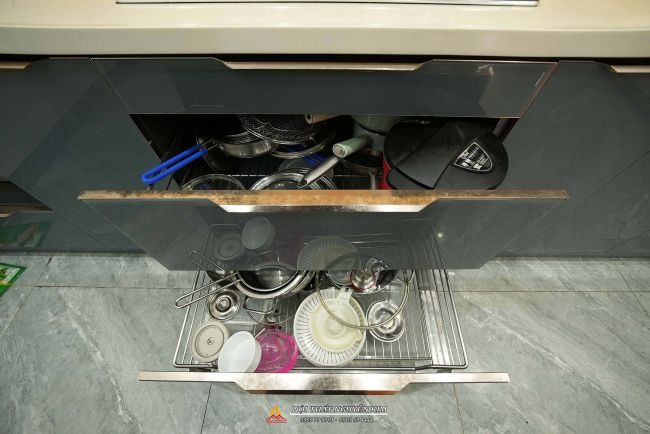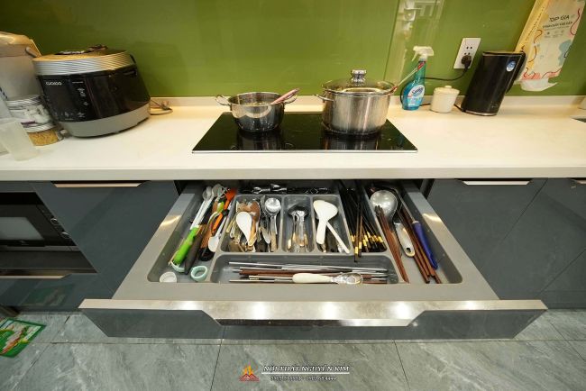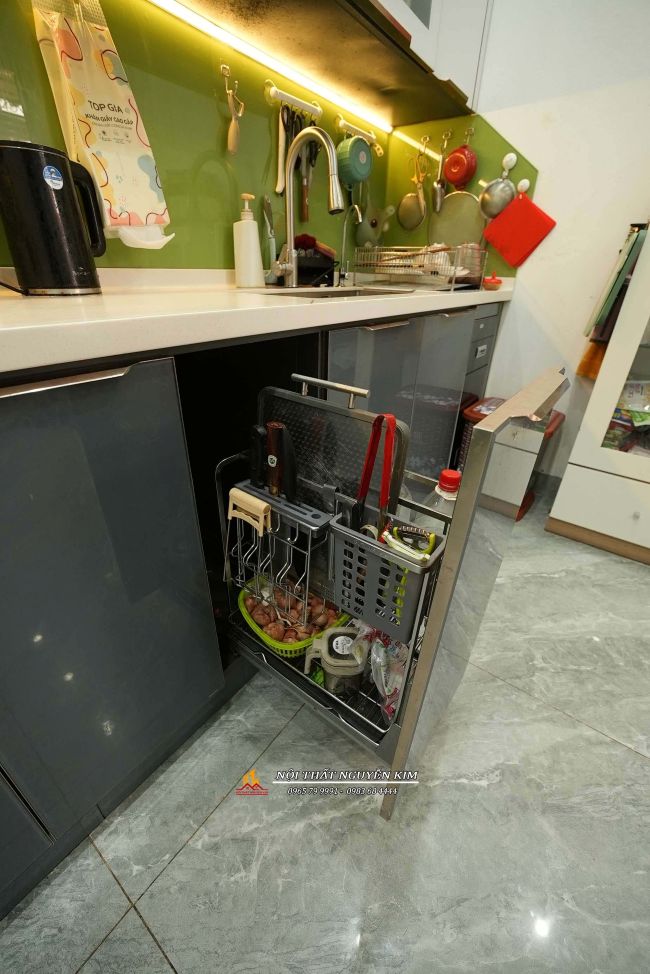 - Bộ tủ bếp được thiết kế full thiết bị, phụ kiện bao gồm: giá bát nâng hạ, hút mùi, bếp từ, chậu vòi, thùng gạo thông minh, giá xoong nồi, dao thớt. Căn bếp nhỏ xinh không quá rộng vẫn tối ưu được chức năng, công năng sử dụng.