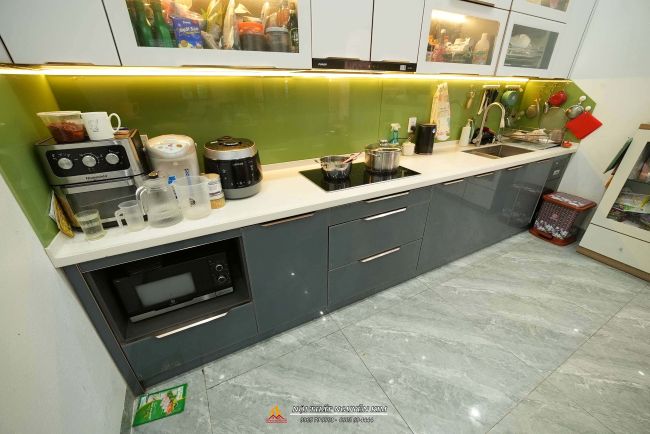 + Màu sắc: Hệ tủ dưới cánh kính màu ghi; hệ tủ bếp trên cánh kính màu trắng, sáng không gian, cảm giác rộng rãi hơn cho căn bếp nhỏ hẹp.