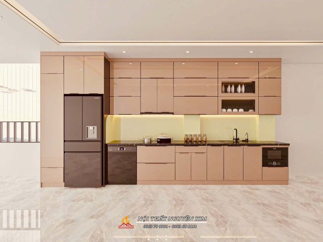 Bộ tủ bếp chữ i cánh kính màu vỏ trứng vô cùng sang trọng, độc đáo