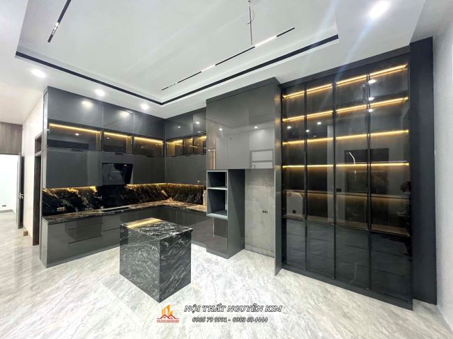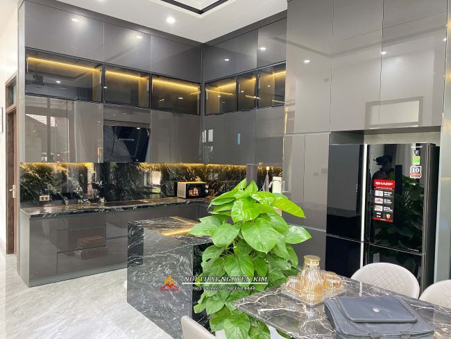 Tủ bếp trên: Cánh tủ acrylic màu ghi ánh kim kết hợp cùng hệ tủ kịch trần cánh kính cường lực màu xám khói.