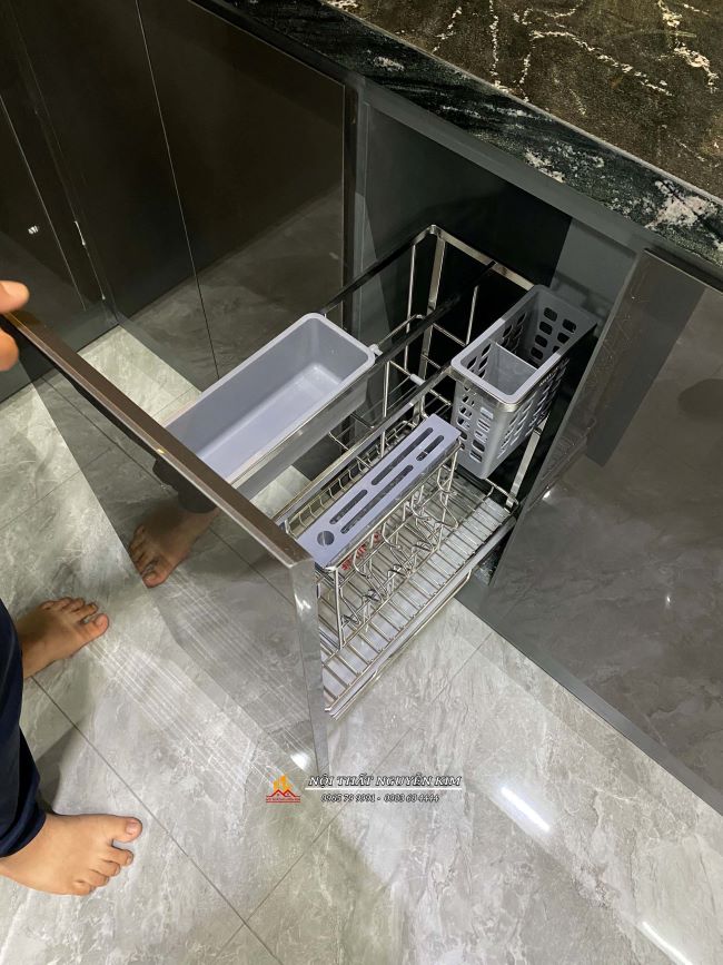 Tủ bếp dưới: Cánh acrylic màu ghi ánh kim
