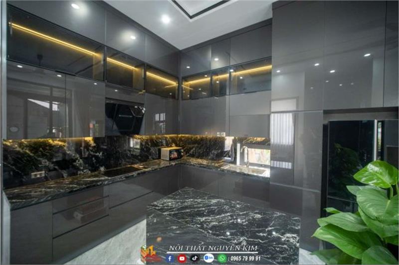 - Bàn bếp và tường bếp được ốp đá mable nhập khẩu Ấn Độ rất sang trọng. Đồng bộ không gian nội thất với bàn đảo, nội thất phòng khách.
