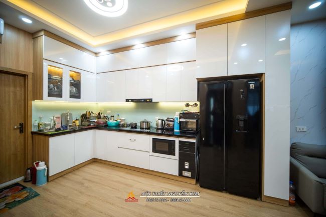 Góc nhìn chính diện căn bếp chữ L rộng rãi, đảm bảo công năng sử dụng