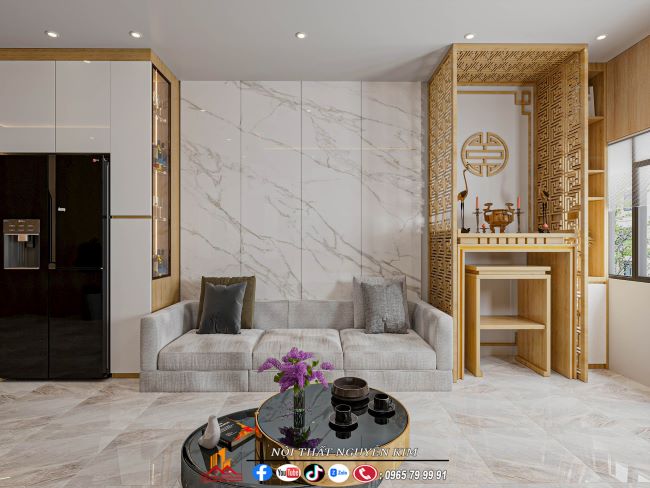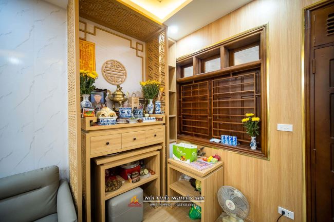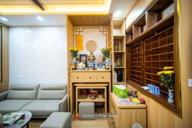 Phòng thờ gỗ sồi nga kết hợp vách trang trí tạo không gian trang nghiêm nơi thờ tự