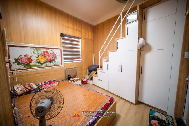 Phòng ngủ này được cải tạo từ Phòng bếp cũ của gia đình anh Trường. Nguyễn Kim thiết kế tối ưu diện tích lối cầu thang lên gác xép thành hệ tủ áo, ngăn kéo để đồ đảm bảo công năng, tính thẩm mỹ cho căn phòng.