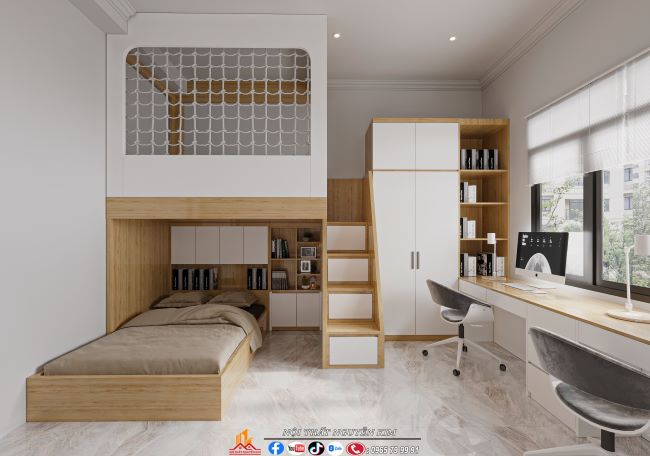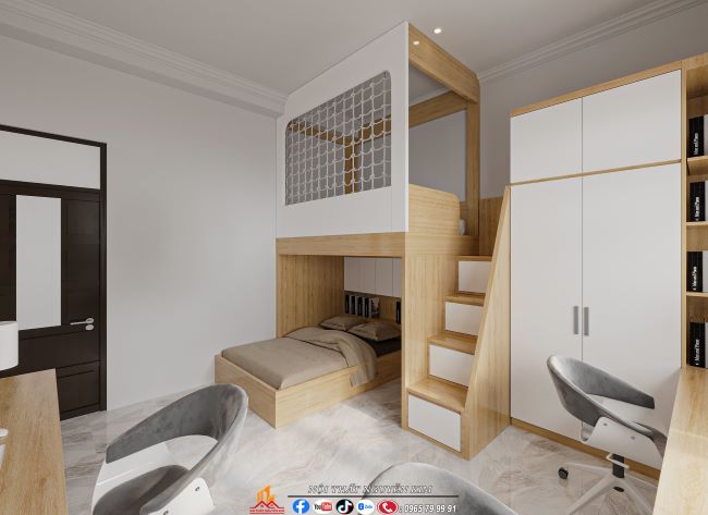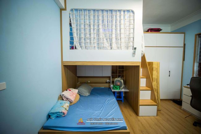 Giường ngủ bên dưới cho con trai, giường tầng phía trên cho con gái tiết kiệm diện tích