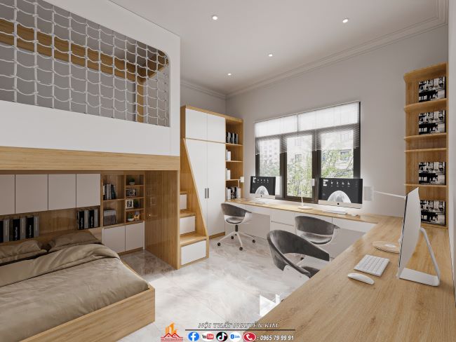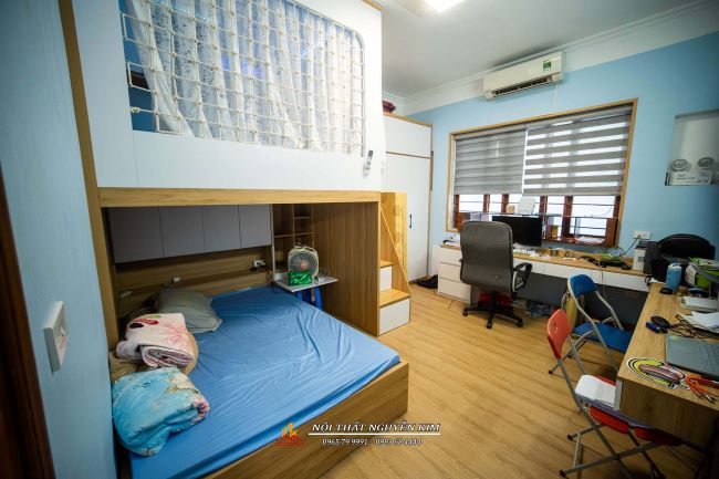Phòng ngủ con trai được Nguyễn Kim thiết kế lại với giường ngủ cho hai bạn, kết hợp hệ giường tầng cho con gái. Phương án thiết kế tối ưu công năng sử dụng cho phòng ngủ diện tích khiêm tốn cho gia đình 04 người.