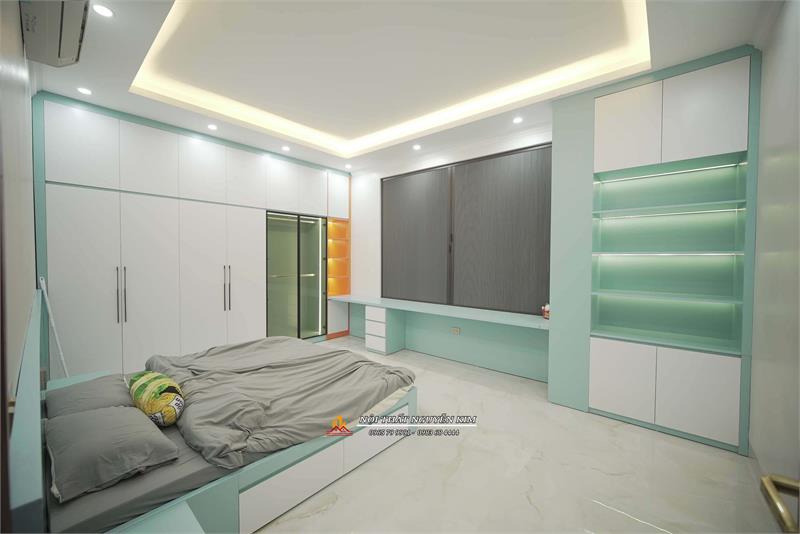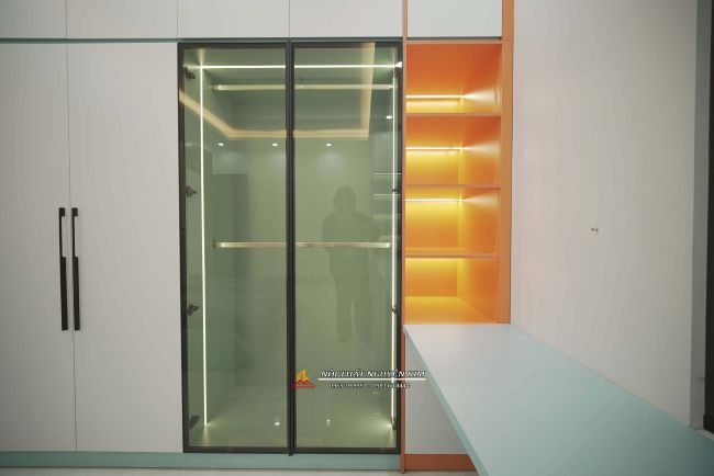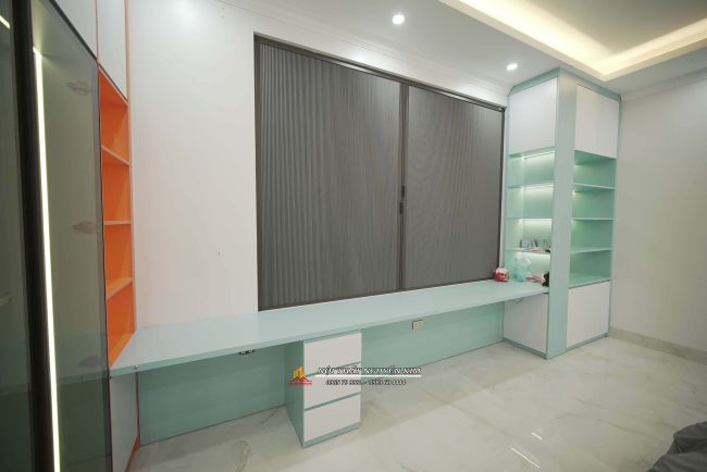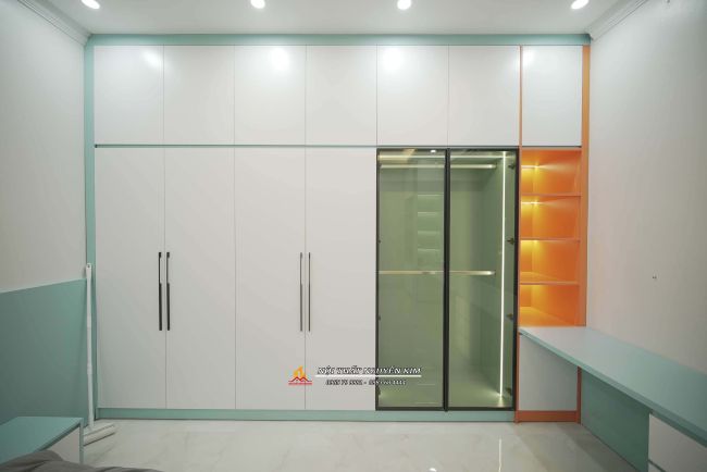 - Phòng ngủ con gái gia đình anh Hiếu ấn tượng với gam màu trắng xanh dịu dàng. Với điểm nhấn của hệ tủ trang trí gam màu cam nổi bật - không gian phòng ngủ siêu xinh dành cho các bé gái. Vẫn là sự kết hợp giữa gỗ MDF lõi xanh phủ melamine màu trắng, xanh, cam kết hợp với cánh kính cường lực màu xám khói.
