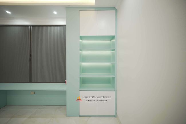 Hệ tủ áo tông màu trắng xanh kết hợp cùng tủ trang trí, bàn học vô cùng xinh xắn, ấn tượng