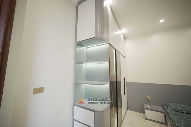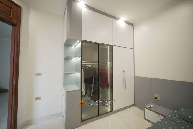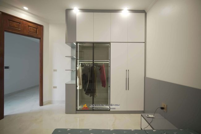 Phòng ngủ master sử dụng chất liệu gỗ công nghiệp MDF lõi xanh phủ melamine vân gỗ, màu trắng là chủ đạo. Giường ngủ, vách ốp đầu giường melamine vân gỗ. Tủ áo là sự kết hợp giữa gỗ công nghiệp với cánh kính cường lực xám khói tạo điểm nhấn. Nơi trưng những bộ đồ, túi xách đẹp, giày dép,... của gia chủ.