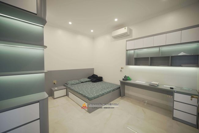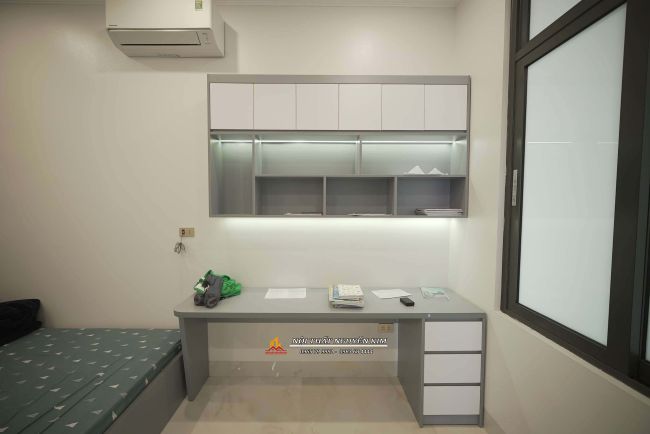 - Phòng ngủ con trai anh Hiếu được thiết kế với tông màu đơn sắc của màu ghi và trắng. Bàn học thiết kế rộng rãi, chắc chắn, tối ưu công năng. Hệ giá sách khá rộng rãi cùng điểm nhấn ánh sáng từ đèn led thêm lung linh, đáng yêu cho góc học tập.