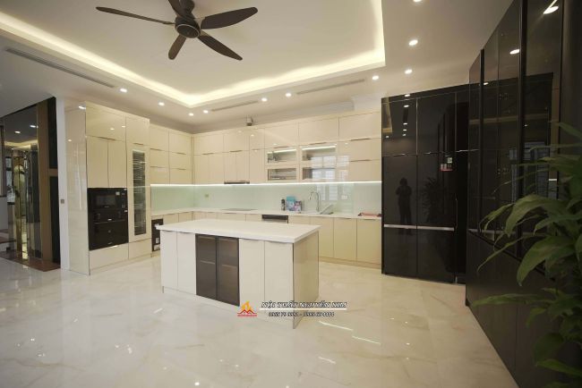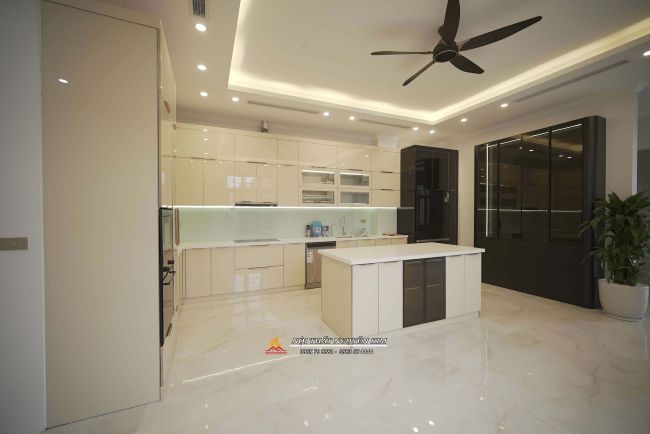 + Phòng bếp: Tủ bếp inox vân caro hệ module một lớp cánh kính cường lực.