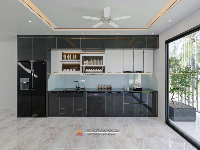 Tủ bếp cánh kính màu đen ấn tượng, hiện đại