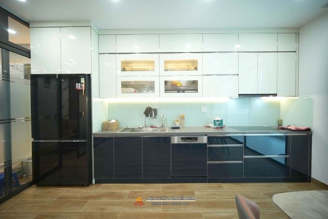 Tủ bếp inox cánh kính màu trắng kết hợp xanh navy nhà anh Hùng, Nguyễn Văn Huyên