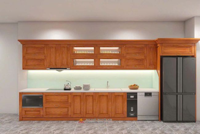- Với chiều dài căn bếp trên 3m, gia đình anh lựa chọn tủ bếp chữ I theo kích thước tiêu chuẩn. Cánh gỗ gõ đỏ với màu vàng tươi vân sẫm được thiết kế dạng cánh pano với tính thẩm mỹ cao.