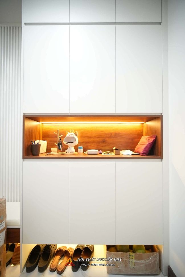 + Phòng khách: tủ giày, kệ tivi gỗ MDF lõi xanh, tủ rượu cánh kính xám trong