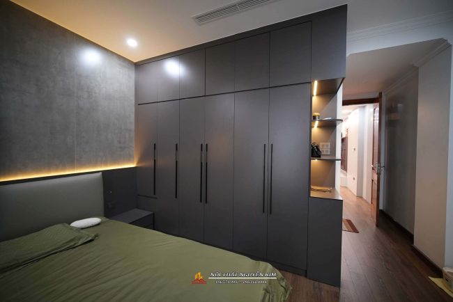 Chất liệu chủ đạo gia đình chú Đức lựa chọn là gỗ công nghiệp MDF lõi xanh phủ melamine cùng cánh kính cường lực cho hệ tủ áo. Màu sắc đồng bộ nội thất là màu ghi đậm kết hợp màu vân bê tông lịch lãm, sang trọng.