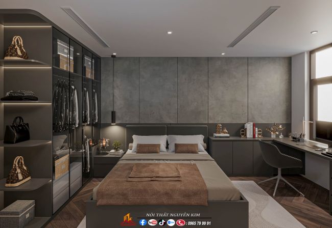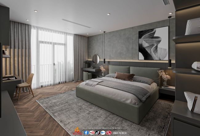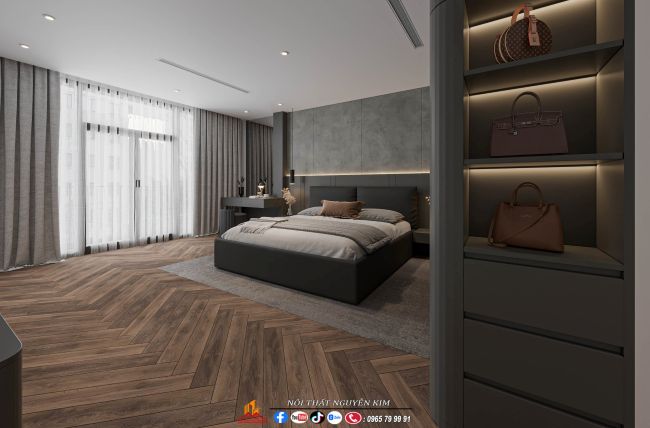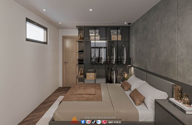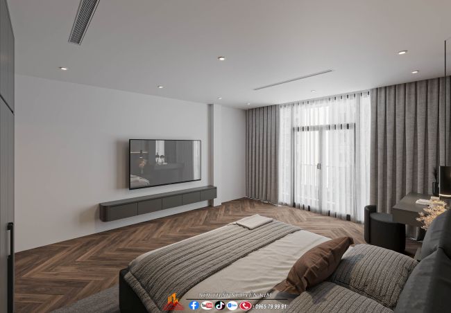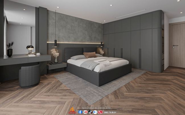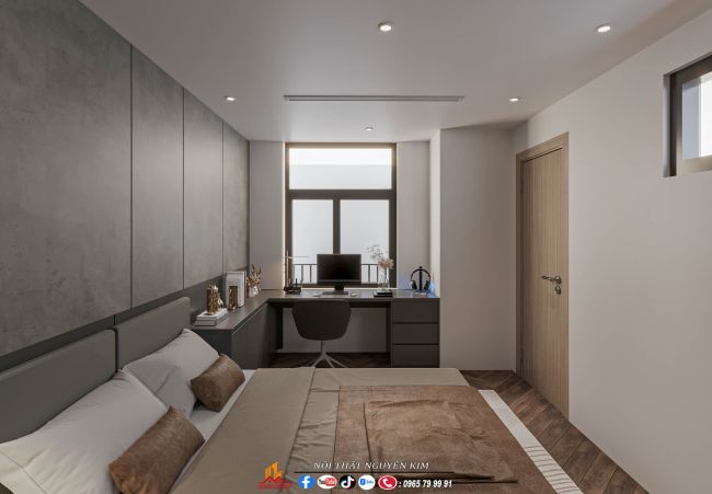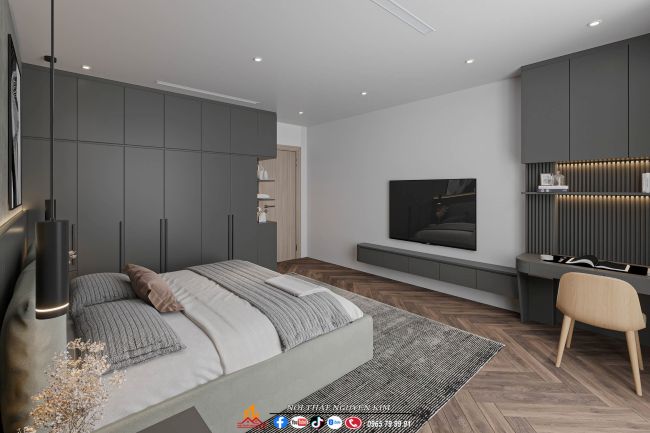 Phòng ngủ ông bà tầng 3 với thiết kế tông màu chủ đạo là màu ghi đậm với màu bê tông cho hệ vách đầu giường như phòng ngủ tầng 4. Thiết kế phòng ngủ khá đơn giản với đầy đủ công năng từ: hệ tủ áo, bàn làm việc, kệ tivi treo tường như phòng ngủ master tầng 4.