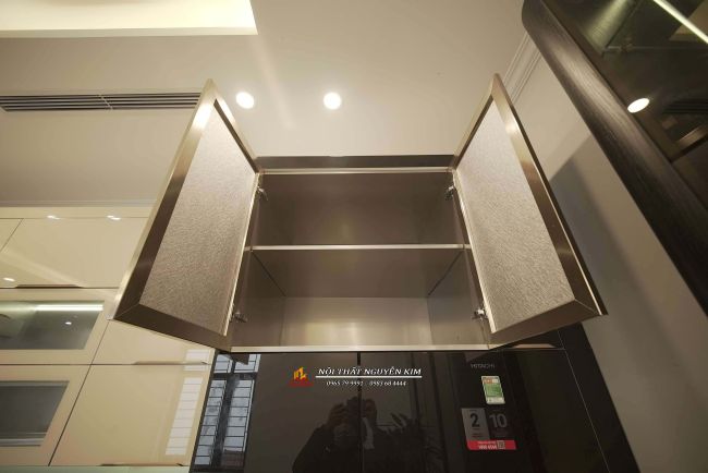 - Tủ trang trí, tủ rượu được thiết kế riêng biệt với tủ bếp ấn tượng với gam màu ghi đậm của chất liệu gỗ công nghiệp MDF lõi xanh. Cánh tủ sử dụng kính cường lực xám khói sang trọng với ánh sáng đèn led tôn lên vẻ đẹp lung linh, sang chảnh cho đồ trưng bày, rượu đặt bên trong tủ.