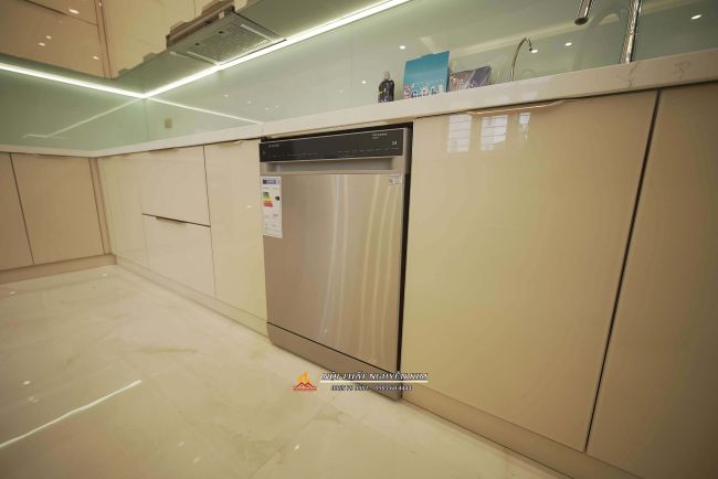 - Bộ tủ bếp kiểu dáng chữ L có bàn đảo bếp ấn tượng với tông màu be sáng được gia chủ chọn lại khi ký hợp đồng. Kết hợp hệ tủ rượu mà ghi, cánh kính xám khói tọa sự hài hòa tổng thể không gian nội thất phòng bếp hiện đại.