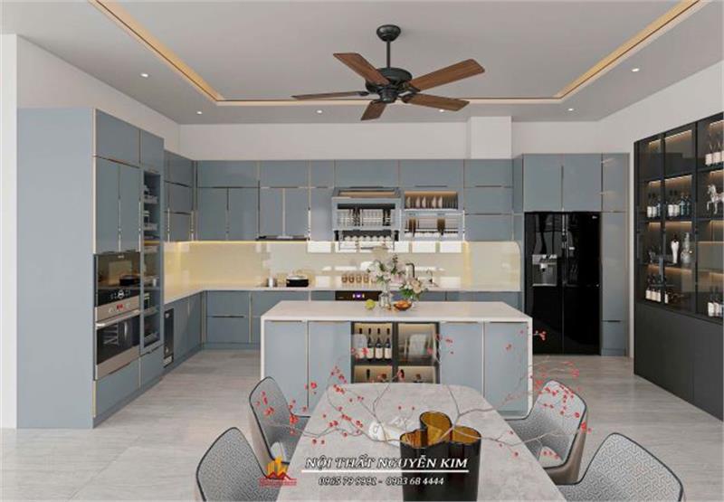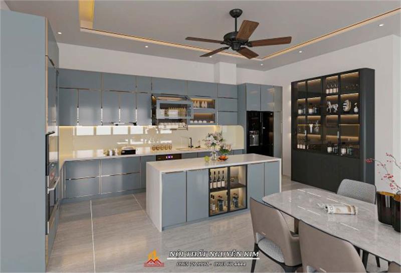 Bàn đảo bếp thiết kế khoang tủ trang trí cánh kính xám trong