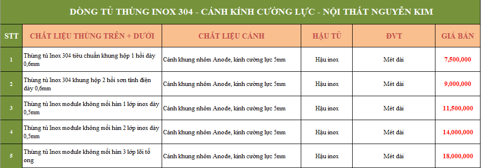 - Hiện nay giá tủ bếp inox cánh kính cường lực tại Nội thất Nguyễn Kim dao động từ 7,5 triệu/md - 18 triệu/md theo kích thước tiêu chuẩn. Giá tại xưởng sản xuất trực tiếp của chúng tôi, không qua bất kỳ một đơn vị trung gian nào, cam kết giá cạnh tranh cao trên thị trường hiện nay.